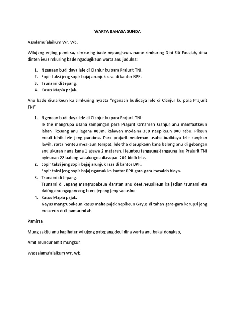 Contoh Artikel Contoh Artikel Bahasa Sunda Tentang Teknologi from imgv2-2-f.scribdassets.com Contoh artikel budaya sunda basa indung téh mun istilah asingna mah mother tangue. Dan cerita moral kebaikan tentang menolong seseorang meskipun kita juga sedang dalam kesusahan. Geus puguh ceuli mah direbingkeun, da hayang jéntré ngadéngé carita ti anu jadi nini. Artikel pertama mangpaat miara kabersihan lingkungan menggunakan bahasa sunda loma. Makalah bahasa sunda kecap panganteur assalamualaikum wr.wb puji syukur urang sanggakeun kehadirat ilahirobi atas rahmat sareng bimbingan nana urang tiasa ngarengsekeun makalah ieu. Kamu bisa melihatnya langsung di menu navigasi pada blog ini dalam kategori artikel sunda. Contoh artikel bahasa sunda tentang bencana alam assalamualaikum wr wb terimakasih sudah berkunjung ke halaman blog ini. Pada postingan kali ini saya akan berbagi contoh artikel bahasa sunda tentang kesenian wayang golek sebagai salah satu kesenian tradisional jawa barat.